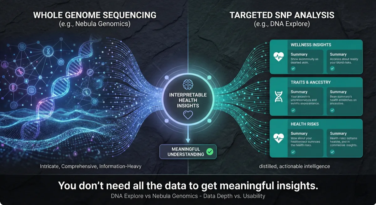 Nebula Genomics and DNA Explore serve different parts of the journey. Nebula is for getting sequenced. DNA Explore is for understanding data you already have. If you've got a 23andMe or AncestryDNA file, DNA Explore gives you instant insights for $9.99 — no need to spend $99-$999 and wait 6-12 weeks for new sequencing.